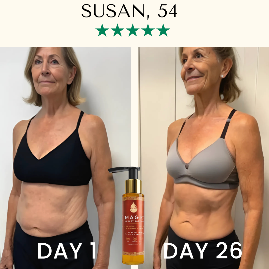 Yes, Our Magic Firming Body Oil is formulated with active ingredients such as collagen and elastin, which are essential for maintaining skin firmness and elasticity. These components help improve skin texture and reduce the appearance of sagging areas.